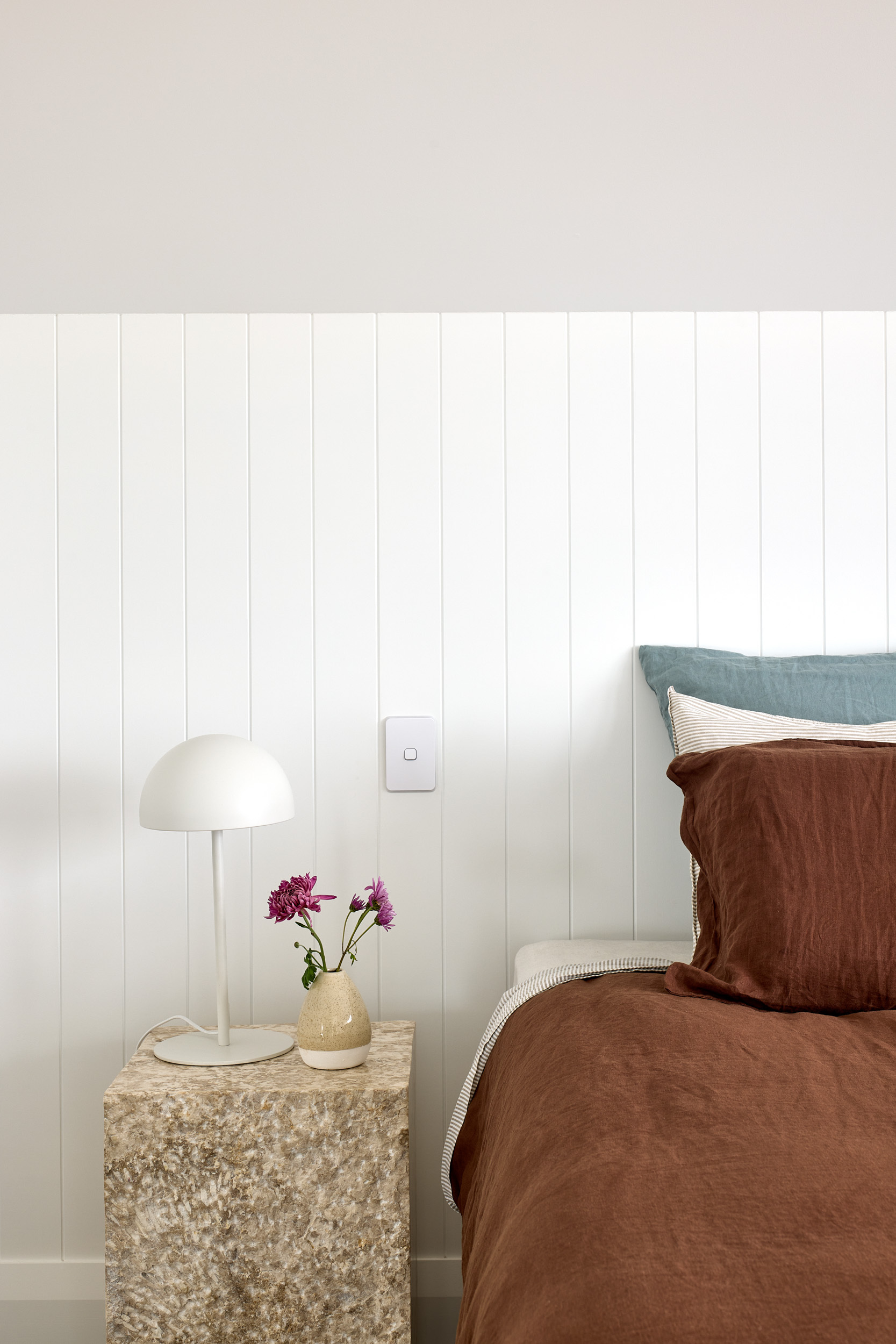 For the interior, Hardie™ Groove Lining became the key element for adding warmth and texture throughout. Rather than using it as a single feature, Samuel and Georgia integrated it thoughtfully across multiple spaces: as kitchen and pantry splashbacks, creating visual interest in the entry and laundry, and as a focal point in the main bedroom and bathroom. Painted in Resene Quarter Rice Cake, the grooved profile brings subtle depth and character to each space.