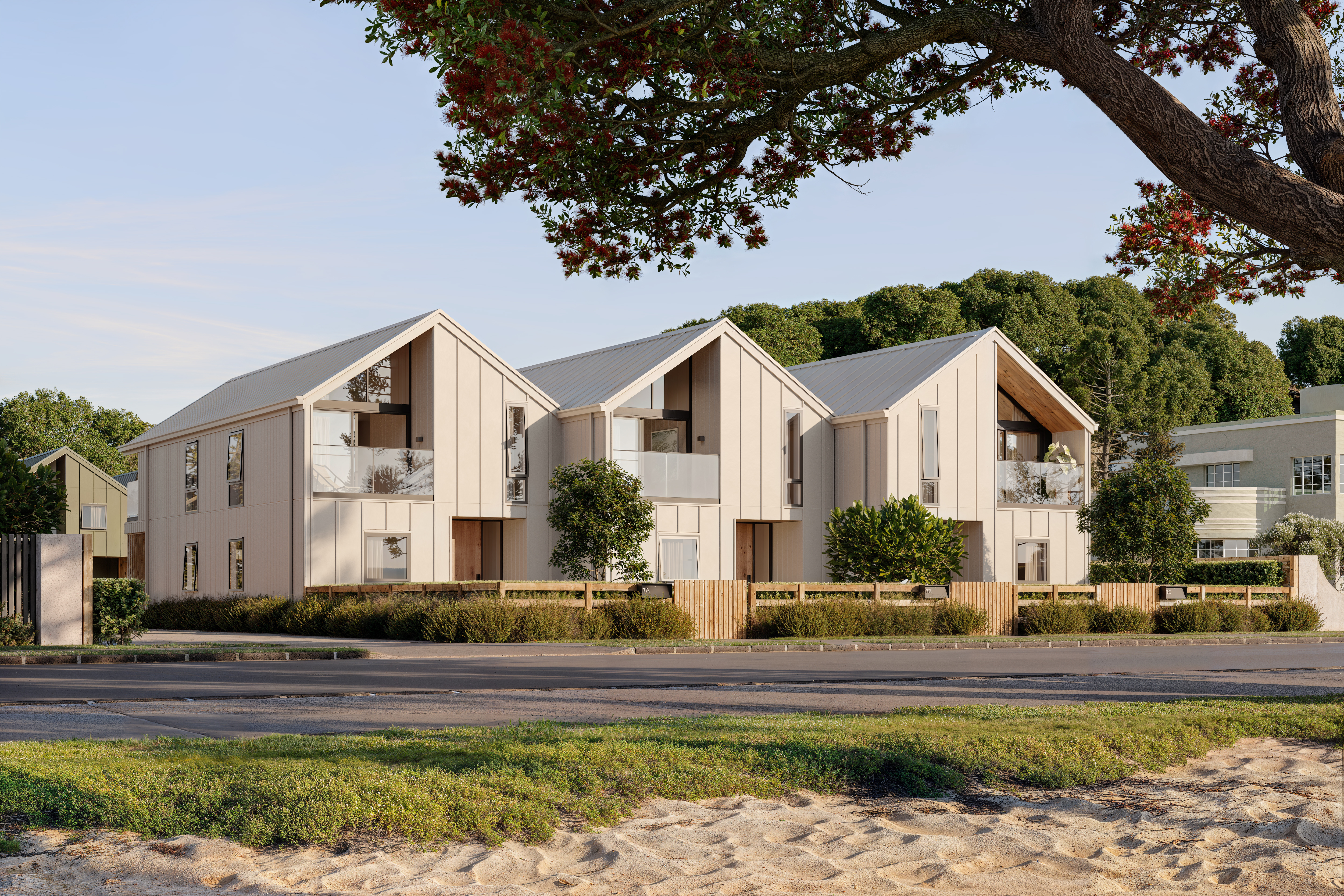 Dramatic rooflines, asymmetrical details, and expressive forms inject bold personality, while overlaid materiality and light create immersive, natural beauty. Effortless flow is achieved through strategic natural light, airflow, and smart, passive design, and simplified, graphic constructions ensure low upkeep and strong visual character while enabling comfort.
