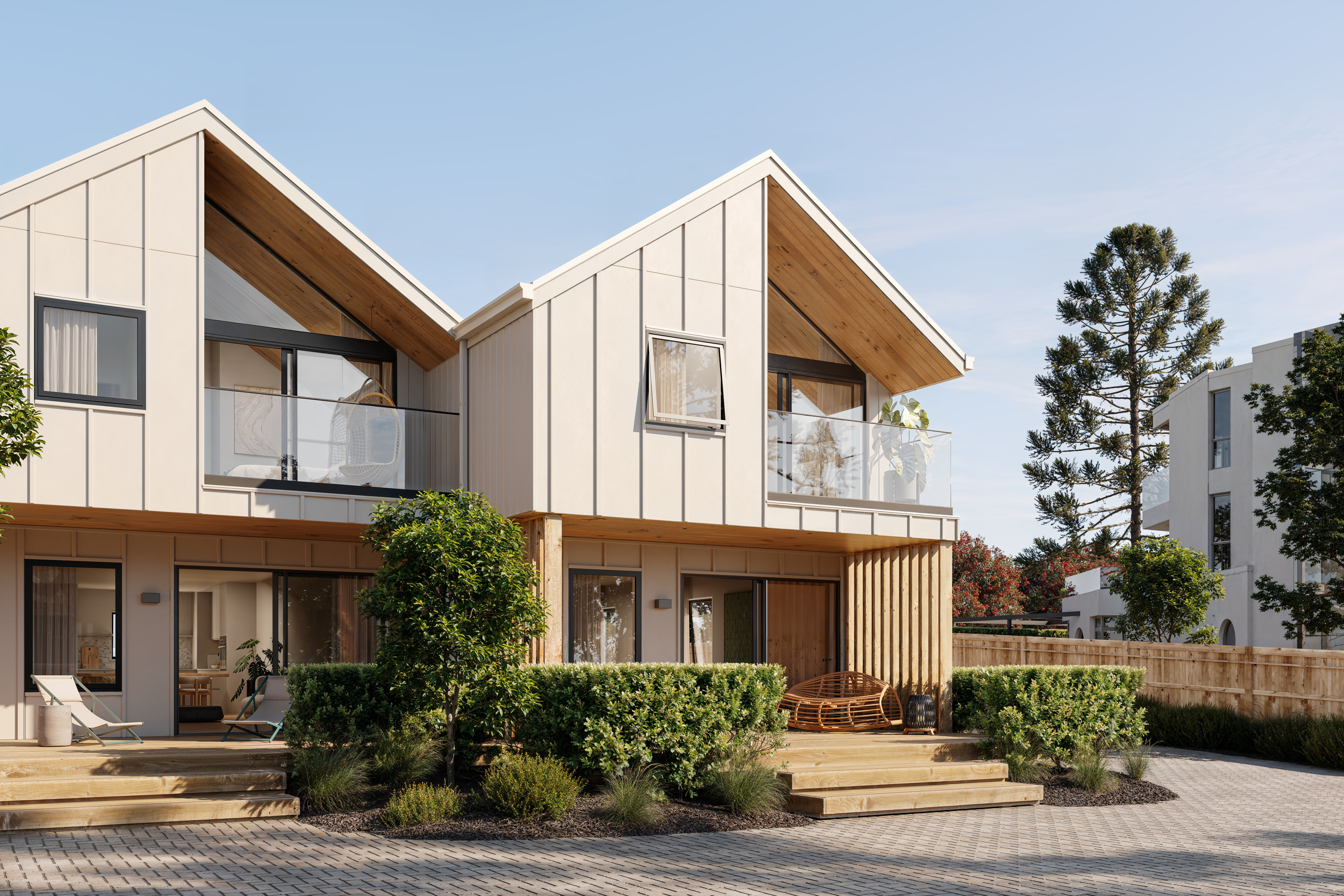 The Barn style reimagines rural forms through a bold and expressive lens. Drawing from its simple, traditional silhouette, this evolution transforms the design through sculptural finishes and rich materiality. Strong form is blended with raw, grounded textures to create a space that is both bold and comforting. Barn’s graphic silhouette is met with layered materiality, deep tones, and textural contrasts that evoke nature’s beauty, while principles of passive design are thoughtfully integrated to add depth and a sense of quiet efficiency.