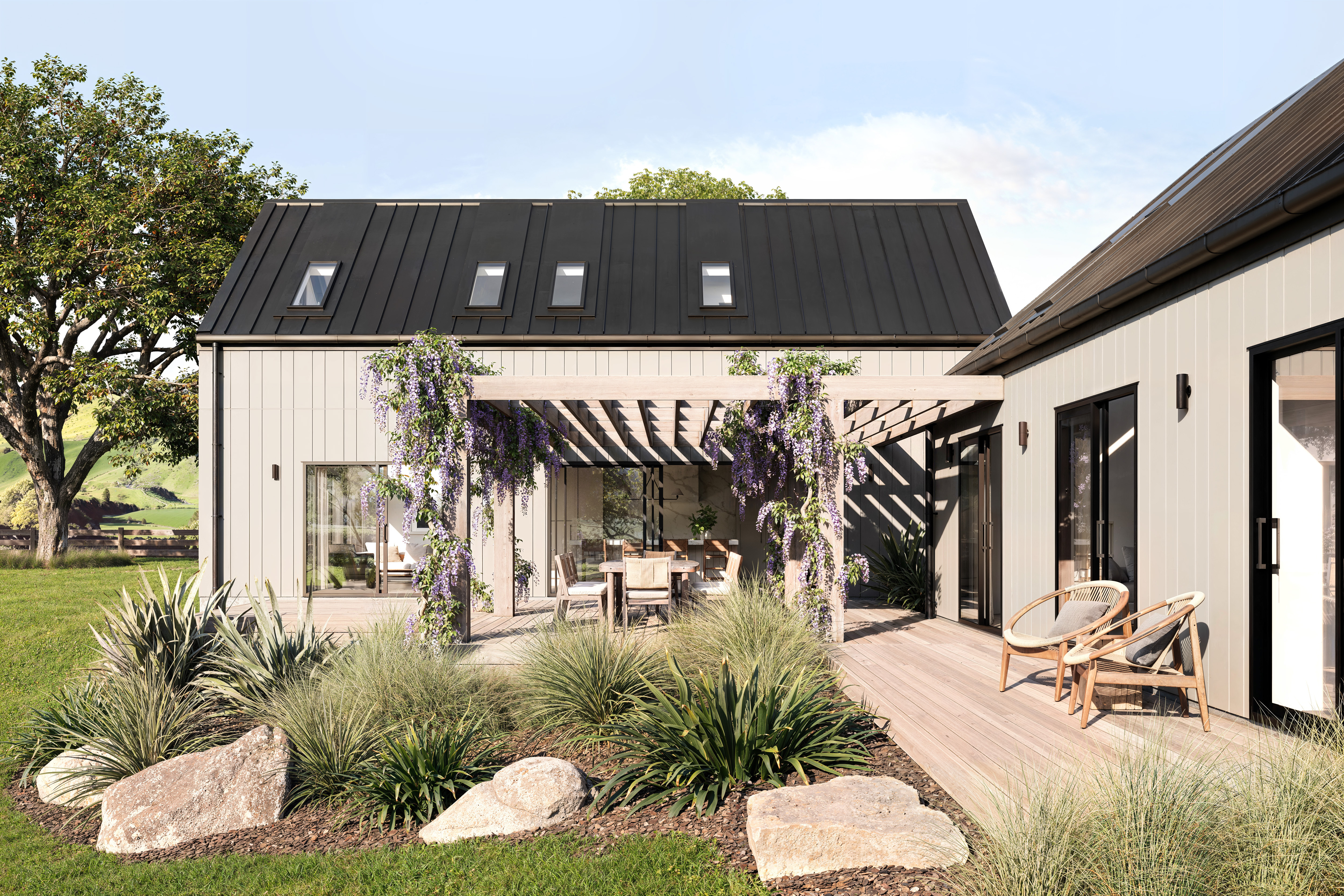 Linea™ Weatherboard: The strong shadow lines of this weatherboard nods to a traditional weatherboard farmhouse with a modern twist. Painted dark with Linea™ Aluminium Corner Soakers differentiates from a more traditional look which has trim covering the corners.